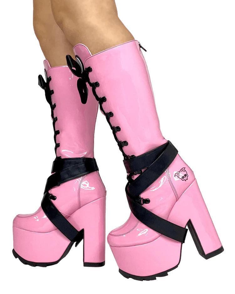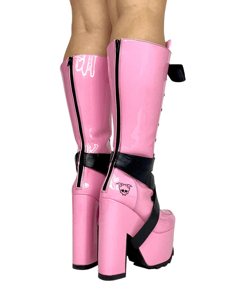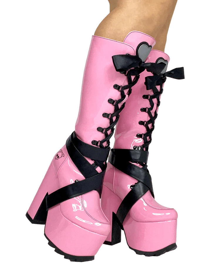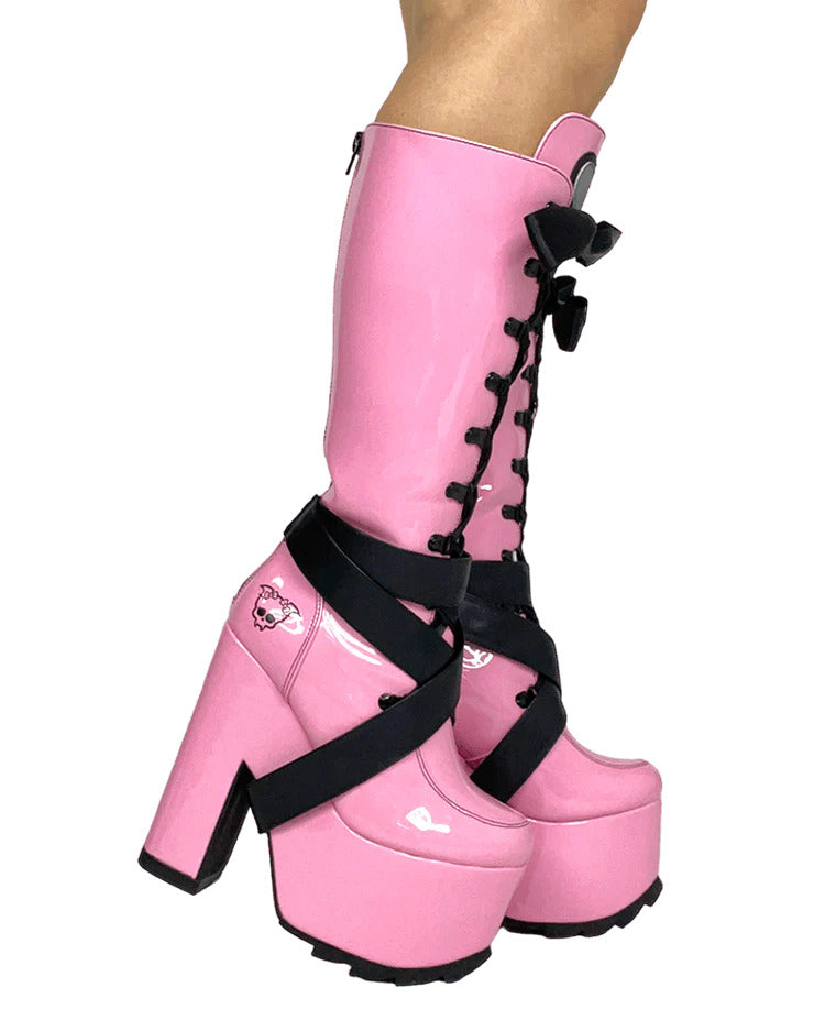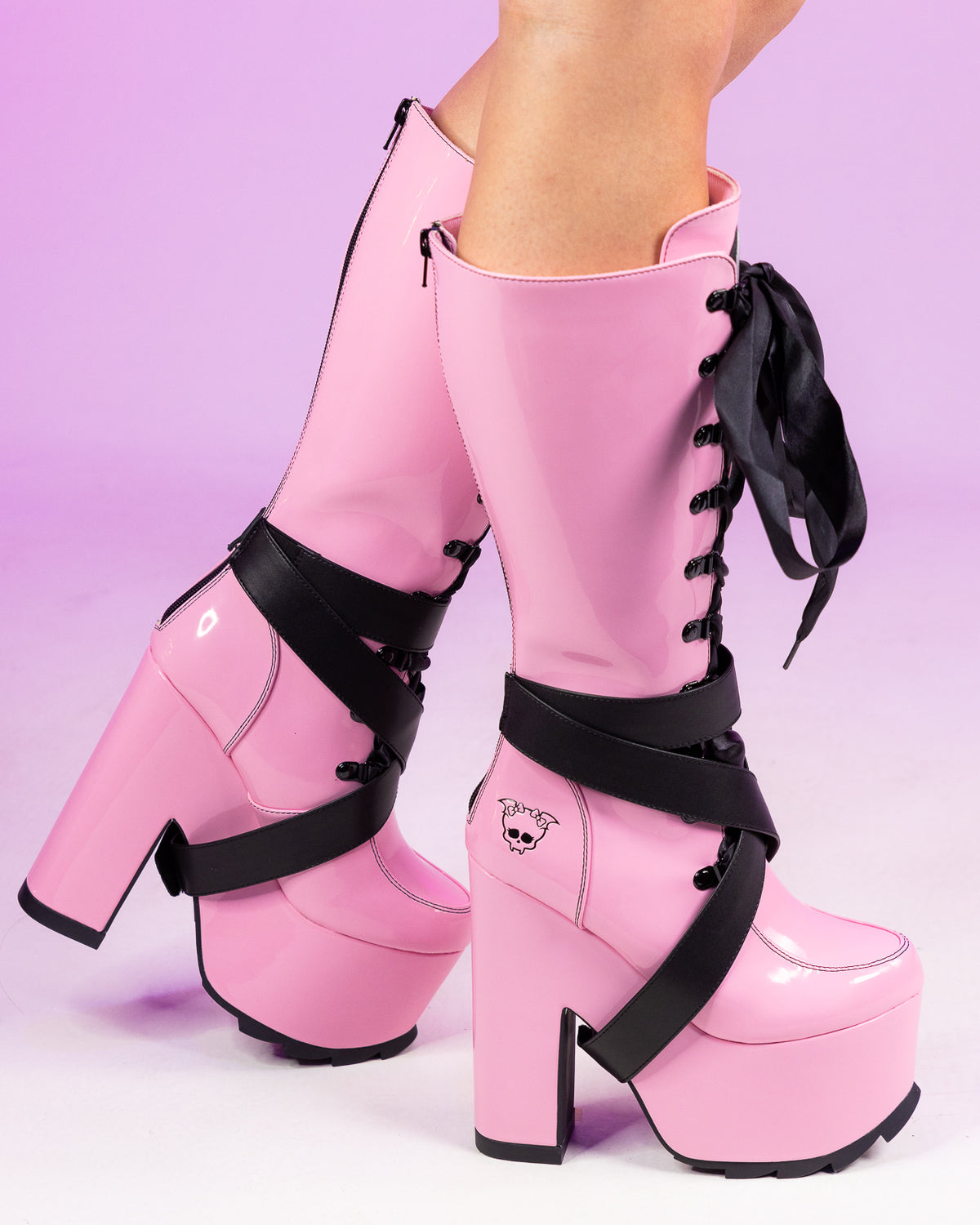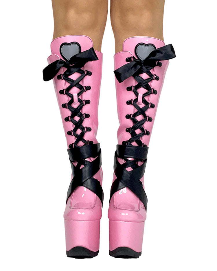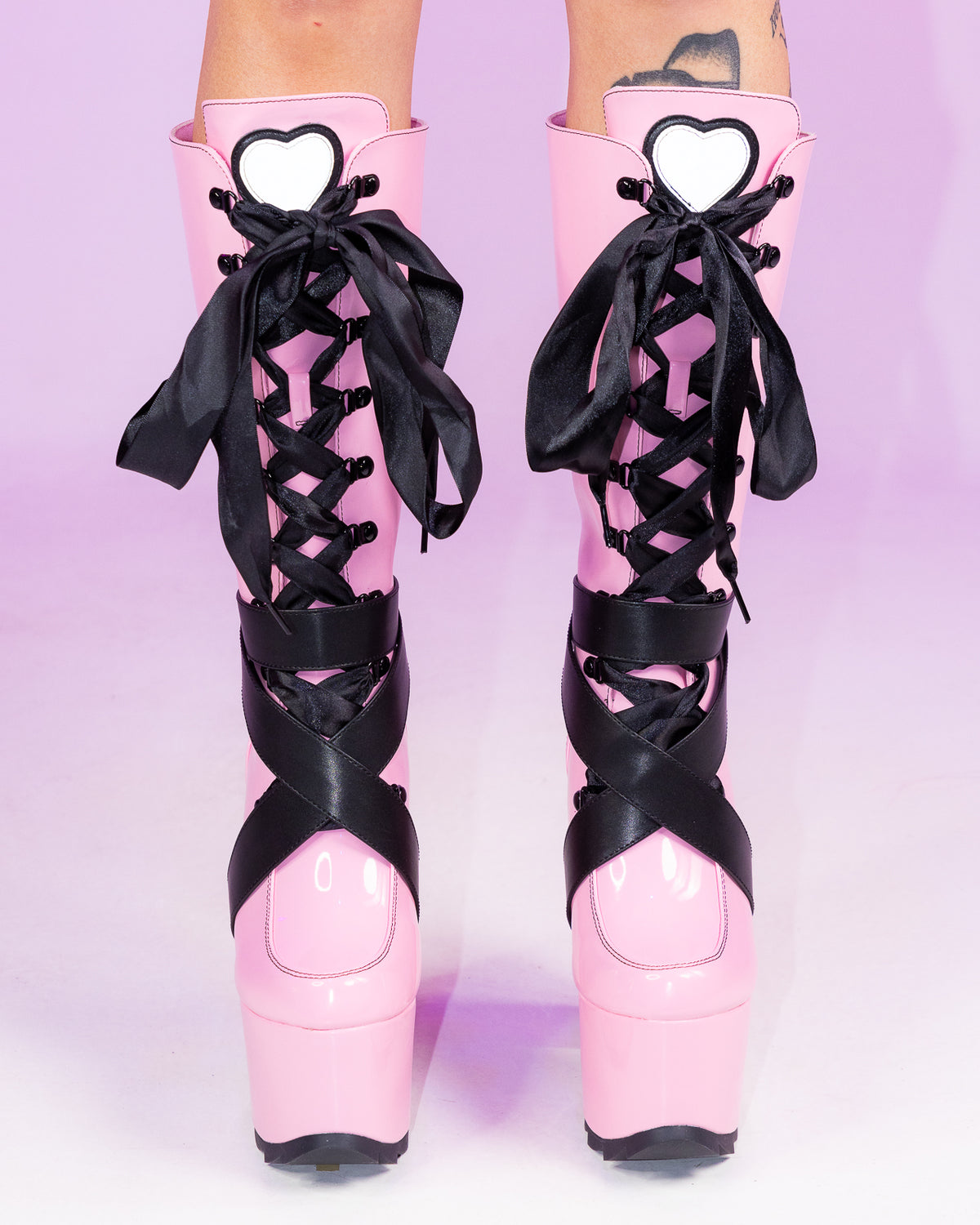 A pink upper made of vegan patent leather is complemented by a black strap detail in vegan leather, as well as black enamel D ring holders and laces made of black satin ribbon. The silver reflective heart on the tongue adds a touch of shine, and the EVA bottom is wrapped in pink vegan patent leather. The bottom also features a black rubber outsole, and the shoe can be easily put on and taken off with the black back zipper closure.